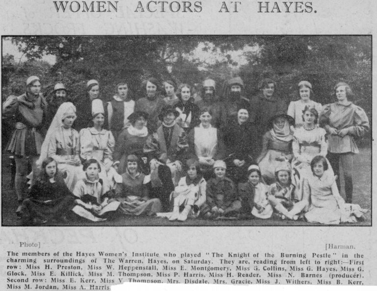 After the war the sisters became involved with local organisations helping with the newly formed Girl Guides and with the plays performed by the local Women’s Institute. In 1928, for example, Percy Harris made the costumes for a Guide entertainment that raised £8. In 1930 Audrey Harris, took part in a WI production of scenes from ‘Quality Street’ by J M Barrie and in 1931 both Peggy and Audrey took part in a Hayes WI performance for which they made the costumes.
